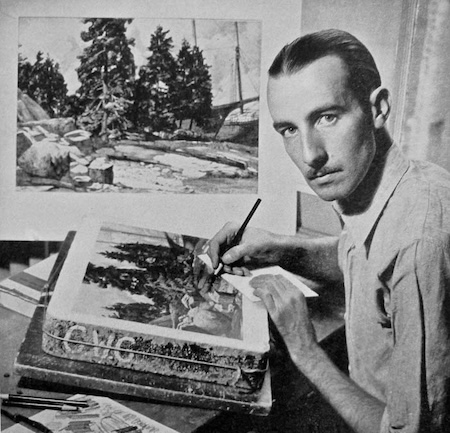 Here he is in a photo from 1937 working on his lithograph, titled “Maine”. Stuckey #67, 1937, Boothbay Harbor, ME. The dry brush study he used for the litho can be seen propped against the wall. The lithograph itself was printed in an edition of 75 and is 10-5/8x15-5/16 inches. The finished lithograph is pictured below.